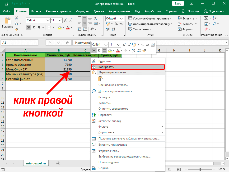 - копирование с помощью выпадающего меню мышки. Для того чтобы воспользоваться этой функцией кликните правой клавишей на ячейке и выберите пункт «Копировать». Затем установите курсор на ячейку, куда вы хотите перенести информацию, кликните по ней правой кнопкой мыши и выберите пункт «Вставить».