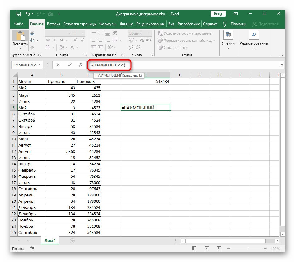 - Активируйте первую ячейку для формулы и введите =НАИМЕНЬШИЙ. Это основная функция, которая автоматически и рассчитает необходимые значения.