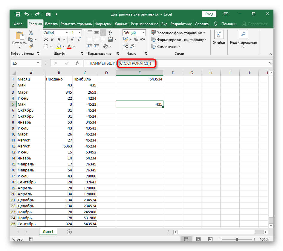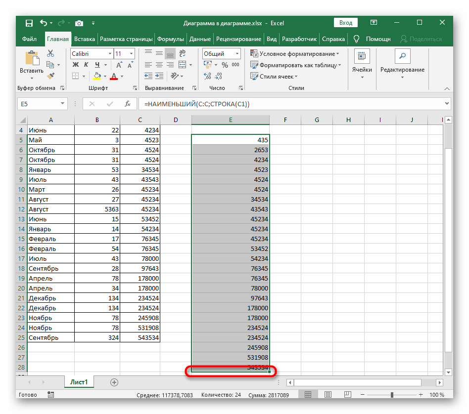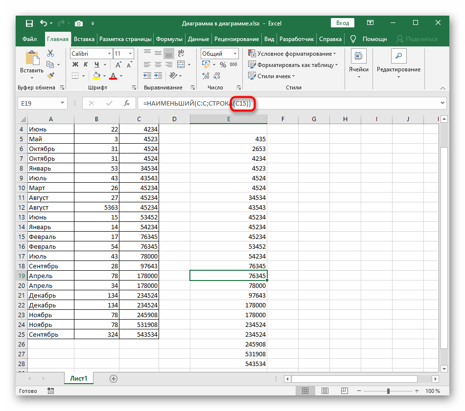 В завершение разберем более сложный, но гибкий способ, подразумевающий создание вспомогательной формулы, которая будет сравнивать значения в таблице и выводить на новых ячейках числа по возрастанию. Преимущество этого метода перед остальными заключается в том, что формула автоматически расширяется при добавлении новых значений в таблицу, а значит, происходит их динамическая сортировка.