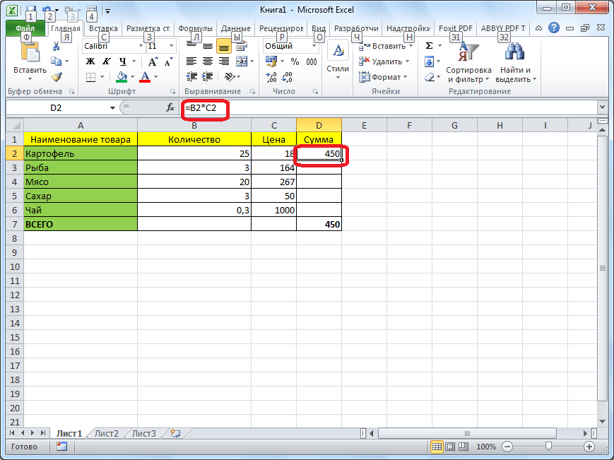 Делается это простым умножением количества (столбец B) на цену (столбец C). Например, для первого наименования товара формула будет выглядеть так «=B2*C2». Вписываем её в соответствующую ячейку таблицы.