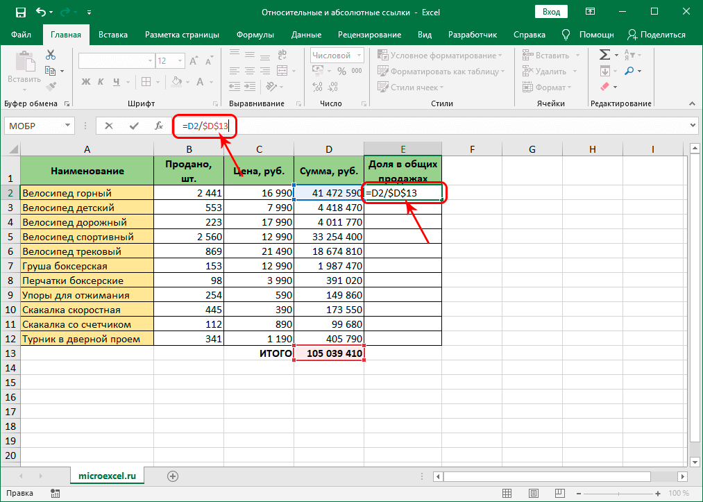 Благодаря использованию символа $ стала возможна фиксация координат ячейки. Каким образом это работает, рассмотрим далее. Так как программа по умолчанию использует относительную адресацию, то соответственно, чтобы сделать ее абсолютной, потребуется выполнить ряд действий. Разберем решение ошибки «Как найти коэффициент от продажи нескольких наименований товара», выполняя расчет при помощи абсолютной адресации:
