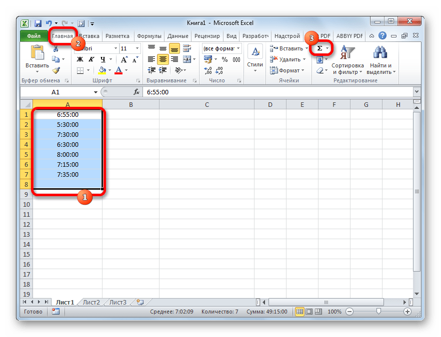 Далее нужно выделить диапазон, заполненный значением времени и одну пустую ячейку после него. Находясь на вкладке «Главная», нажимаем на значок «Сумма», расположенный на ленте в блоке инструментов «Редактирование». Как альтернативный вариант, можно набрать на клавиатуре сочетание клавиш «Alt+=».