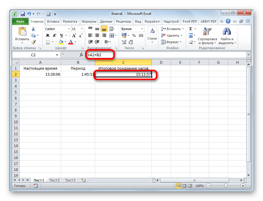 Как видим, происходит вычисление и в изначально выделенной ячейке выводится результат сложения времени.