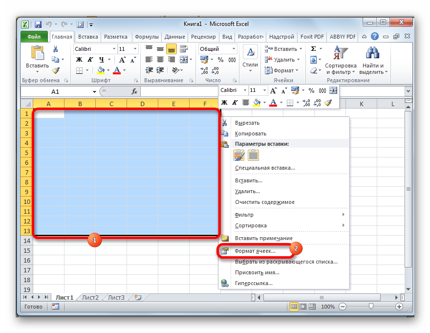 - Кликаем правой кнопкой мыши, тем самым вызвав контекстное меню. Переходим по пункту «Формат ячеек…». Вместо этого можно также после выделения на клавиатуре набрать комбинацию Ctrl+1.