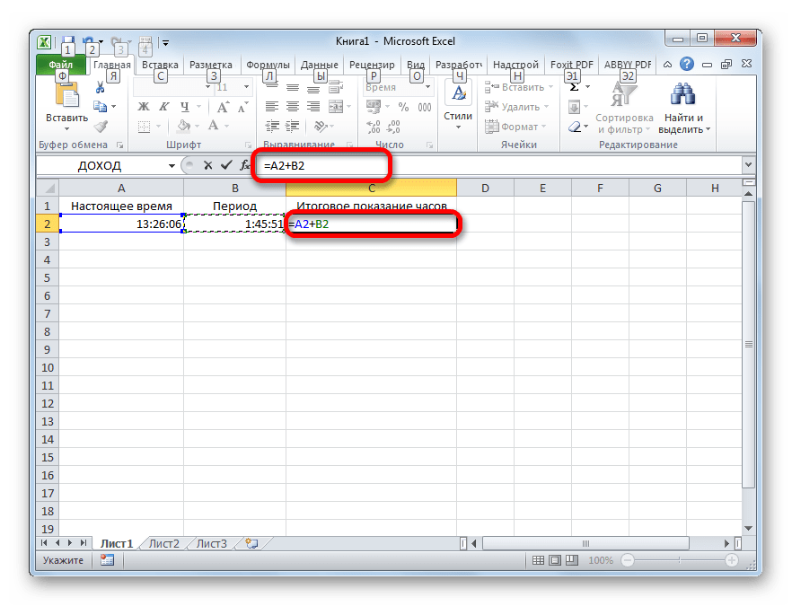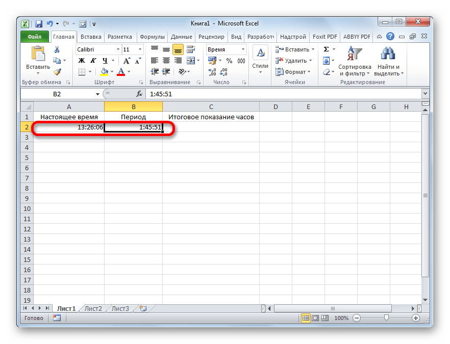В третьей ячейке, в которой тоже установлен формат времени, ставим знак «=». Далее кликаем по ячейке со временем «13:26:06», жмем на знак «+» на клавиатуре и кликаем по ячейке со значением «1:45:51».