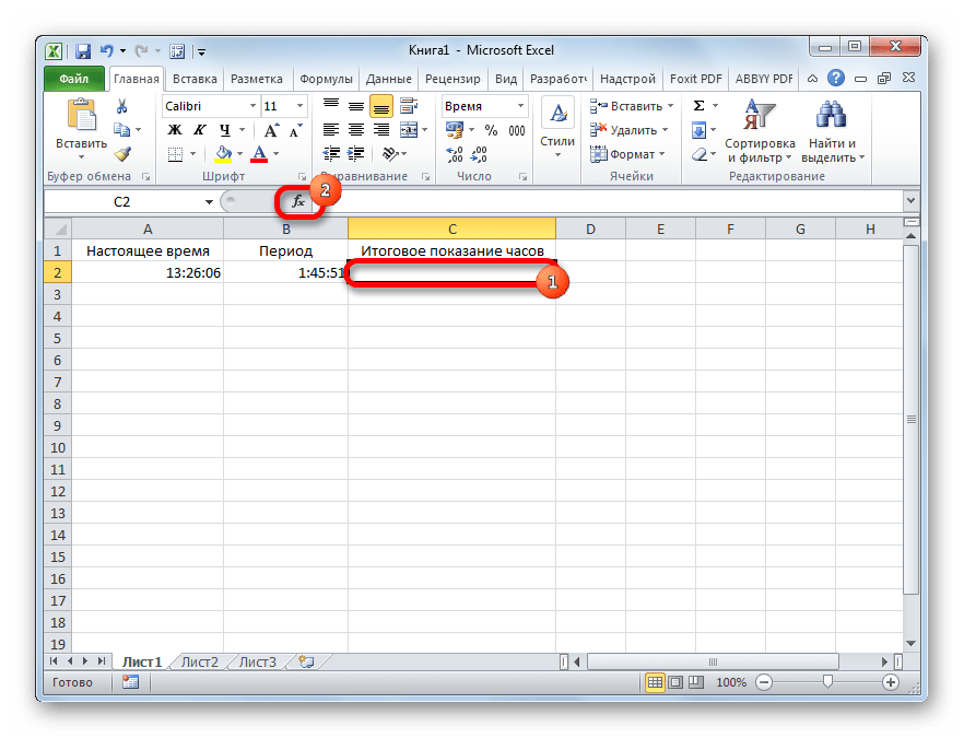 - После того, как первичные данные (текущее показание часов и отрезок времени) введены, выделяем отдельную ячейку. Кликаем по кнопке «Вставить функцию».