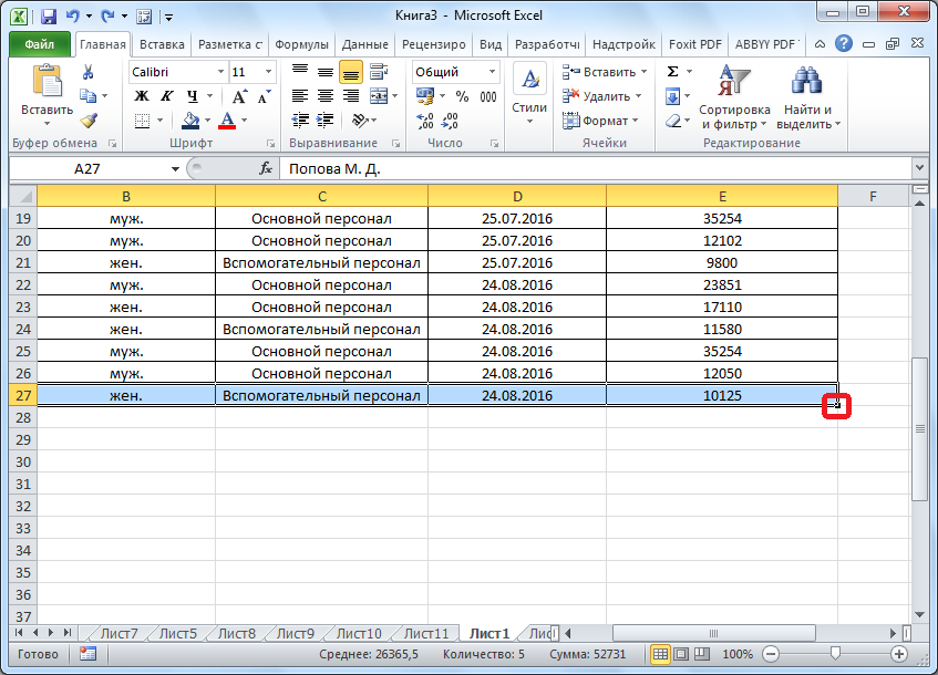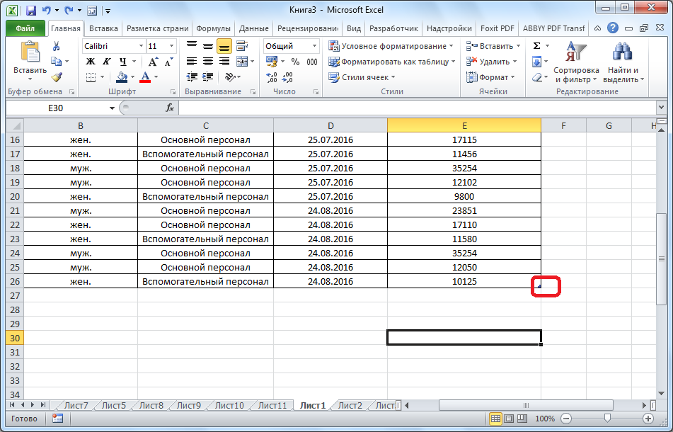 Но, намного удобнее создать, так называемую, «умную таблицу». Это можно сделать один раз, и потом не переживать, что какая-то строка при добавлении не войдет в границы таблицы. Эта таблица будет растягиваемая, и к тому же, все данные внесенные в неё не будут выпадать из формул, применяемых в таблице, на листе, и в книге в целом.