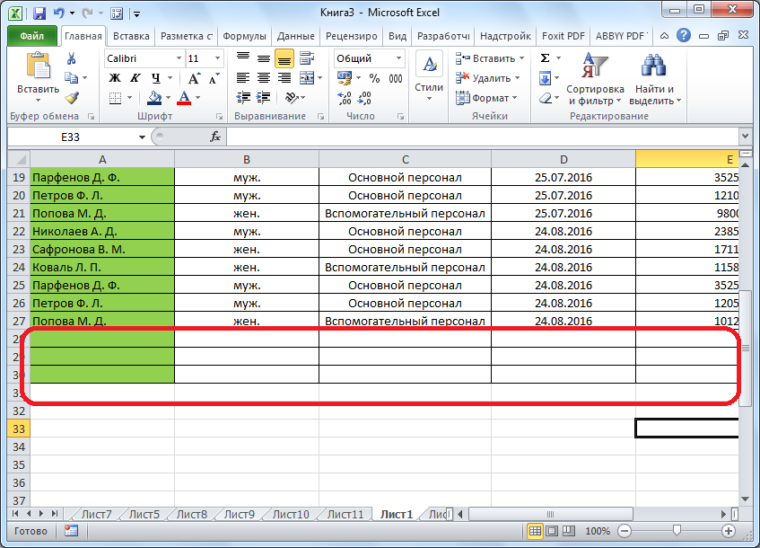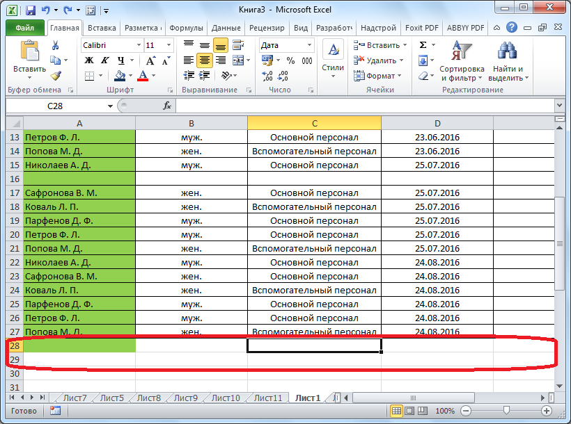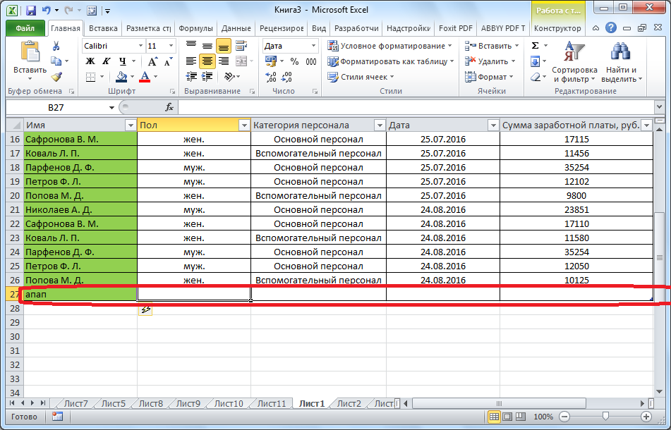 - Выделить строку, следующую за последней строкой таблицы, которая в общем случае может быть заполненной или пустой.