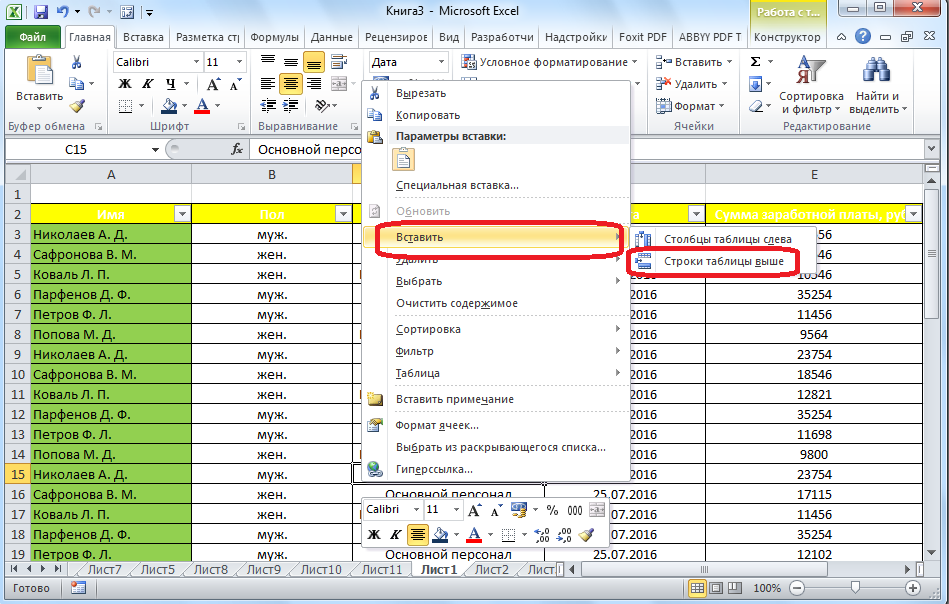 - Чтобы добавить новую строку посредине таблицы, вам нужно только кликнуть по нужной ячейке, выбрать пункт «Вставка», а затем нажать на «Строки таблицы выше». После этого автоматически будет создана новая строка над выбранной ячейкой. При этом контент лучше адаптируется к изменениям в структуре таблицы;