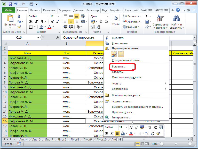 - Щёлкнуть на ней правой клавишей мыши и в контекстном меню выбрать пункт «Вставить». Альтернативный вариант – использование горячих клавиш. Сочетание клавиш Ctrl и + также откроет контекстное меню.
