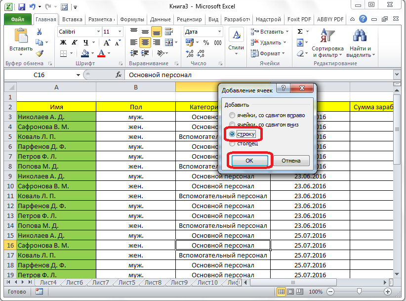 - В окне «Добавление ячеек» выбрать строку плюс OK.