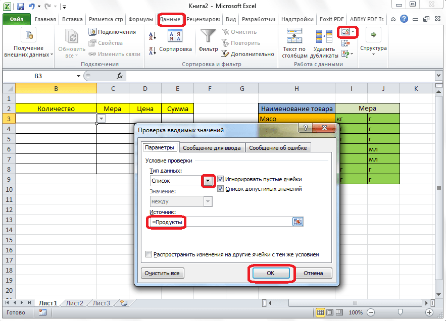 - После этого вставляем общий список с продуктами в верхнюю ячейку первого столбца основной таблицы – как и в описанном выше примере, через кнопку “Проверка данных” (вкладка “Данные”).