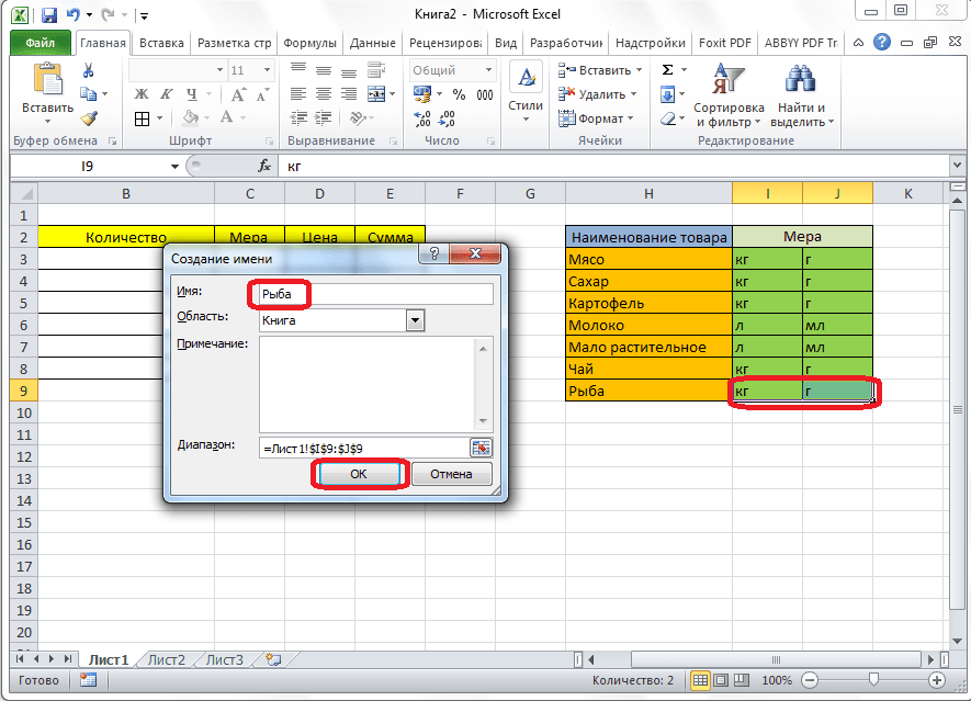 - Затем таким же образом формируем отдельные списки для каждого продукта с соответствующими единицами измерения. Для большей наглядности возьмем в качестве примера первую позицию – “Лук”. Отмечаем ячейки, содержащие все единицы измерения для этого продукта, через контекстное меню присваиваем имя, которое полностью должно совпадать с наименованием.Таким же образом создаем отдельные списки для всех остальных продуктов в нашем перечне.