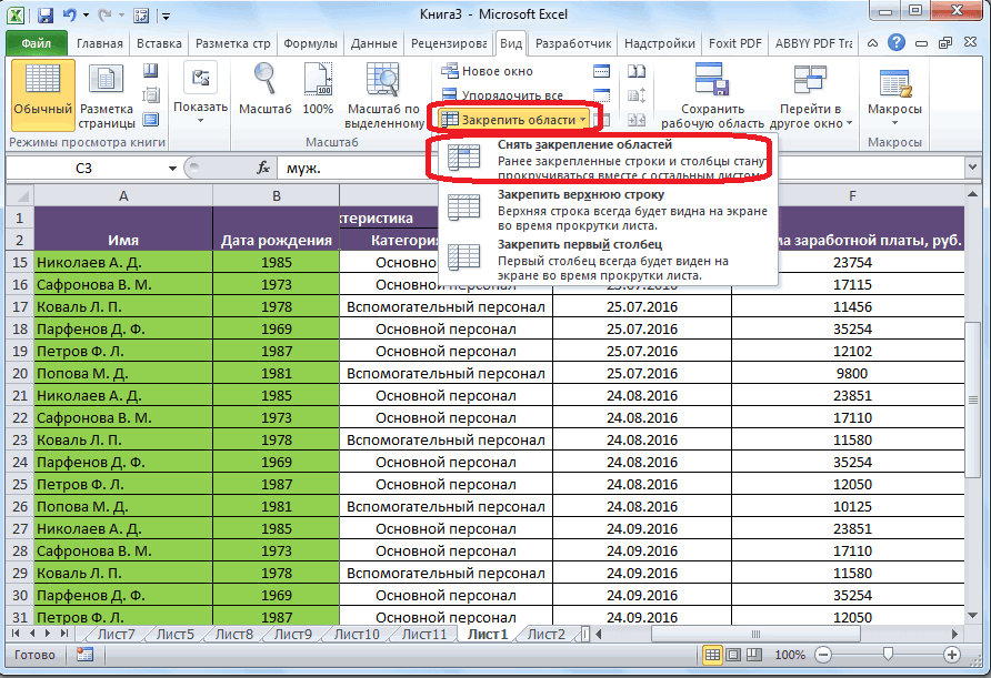 Чтобы убрать закрепление, точно так же как и в предыдущем примере нажмите на «Снять закрепление областей».