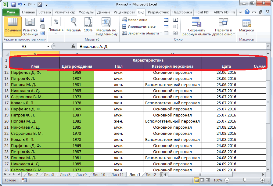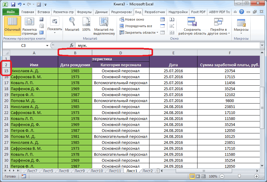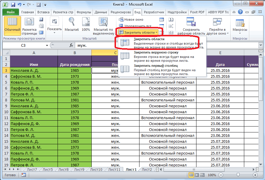 Как видно на скриншоте, если мы хотим зафиксировать первые две строчки, устанавливаем курсор на третью. В результате вы сможете прокручивать содержимое листа, а на экране всегда будет оставаться шапка таблицы.