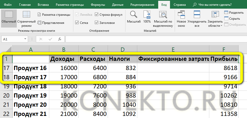 Откройте вкладку «Вид» и воспользуйтесь пунктом «Закрепить области».