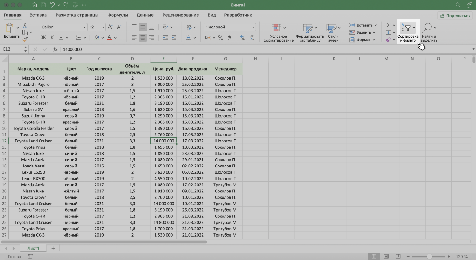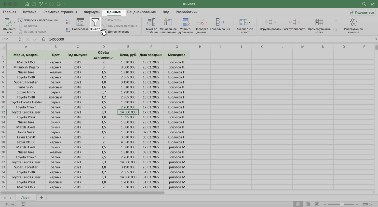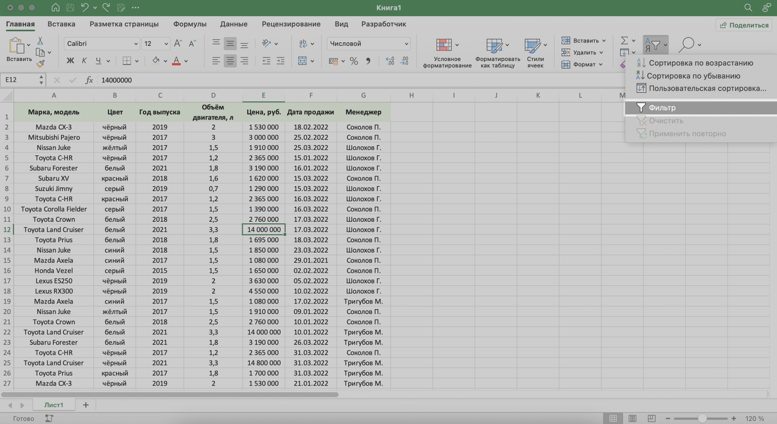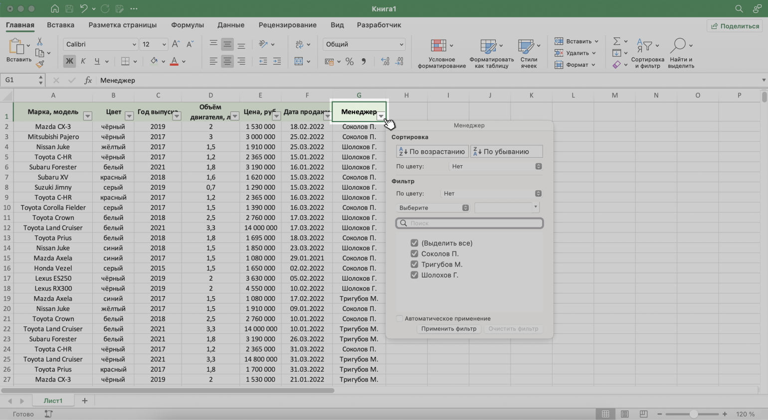 Допустим, нужно показать продажи только одного менеджера — Соколова П. Воспользуемся фильтрацией.