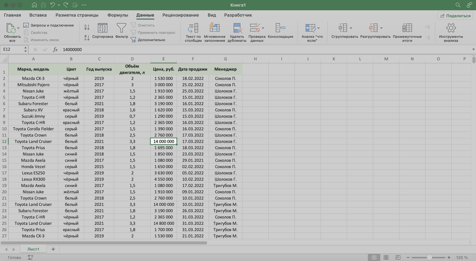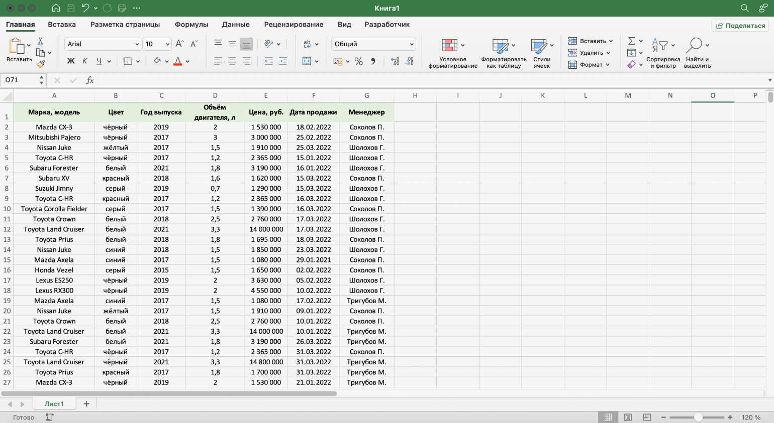 Для примера воспользуемся отчётностью небольшого автосалона. В таблице собрана информация о продажах: характеристики авто, цены, даты продажи и ответственные менеджеры.
