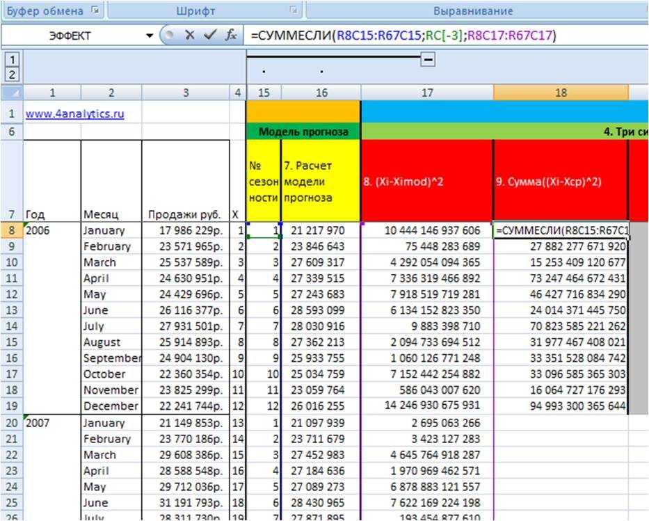 3. Просуммируем для каждого месяца значения отклонений из 8 этапа Сумма((Xi-Ximod)^2), т.е. просуммируем январи, феврали… для каждого года.
