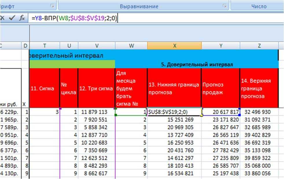 Т.е. Верхняя граница прогноза = «прогноз продаж» + «3 сигма» (в примере, ВПР(номер месяца; таблица со значениями 3-х сигма; столбец, из которого извлекаем значение сигма равное номеру месяца в соответствующей строке;0)).