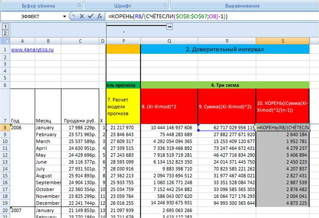 Рассчитав среднеквадратическое отклонение фактических данных от модели прогноза, мы получили значение сигма для каждого месяца — этап 10 во вложенном файле.