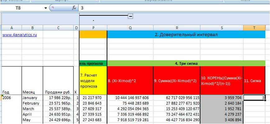 5) Рассчитываем три сигма, для этого мы значения «сигма» для каждого месяца умножаем на «3».