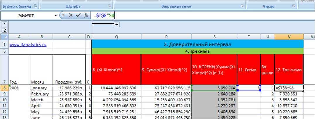 $U$8:$V$19 — таблица, из которой с помощью функции =ВПР извлекаем значение 3-х сигма, соответствующее данному месяцу, фиксируем ссылку на таблицу с помощью F4, подробнее в статье «Как зафиксировать ссылку в Excel».