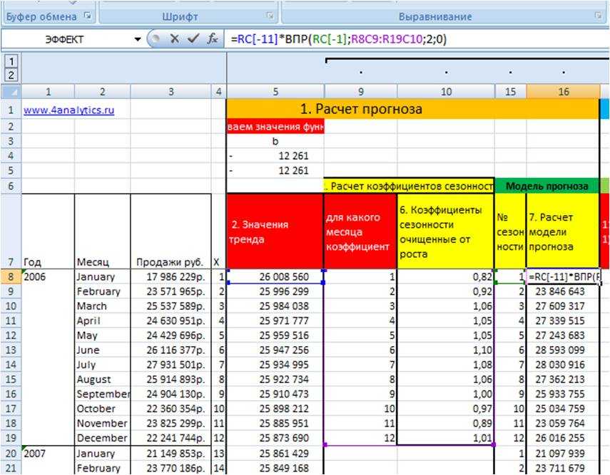 =RC (ссылка на тренд)*ВПР(RC;R8C9:R19C10;2;0)(формула ВПР со ссылкой на коэффициент сезонности соответствующего месяца)