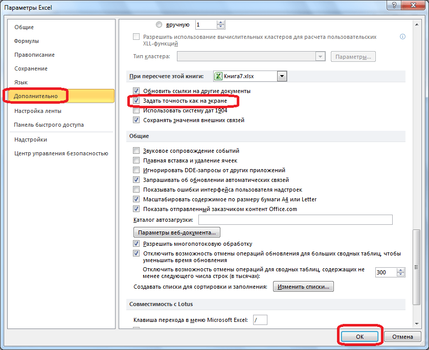Открывается окно параметров Excel. В этом окне переходим в подраздел «Дополнительно». Ищем блок настроек под названием «При пересчете этой книги». Настройки в данном бока применяются ни к одному листу, а ко всей книги в целом, то есть ко всему файлу. Ставим галочку напротив параметра «Задать точность как на экране». Жмем на кнопку «OK», расположенную в нижнем левом углу окна.