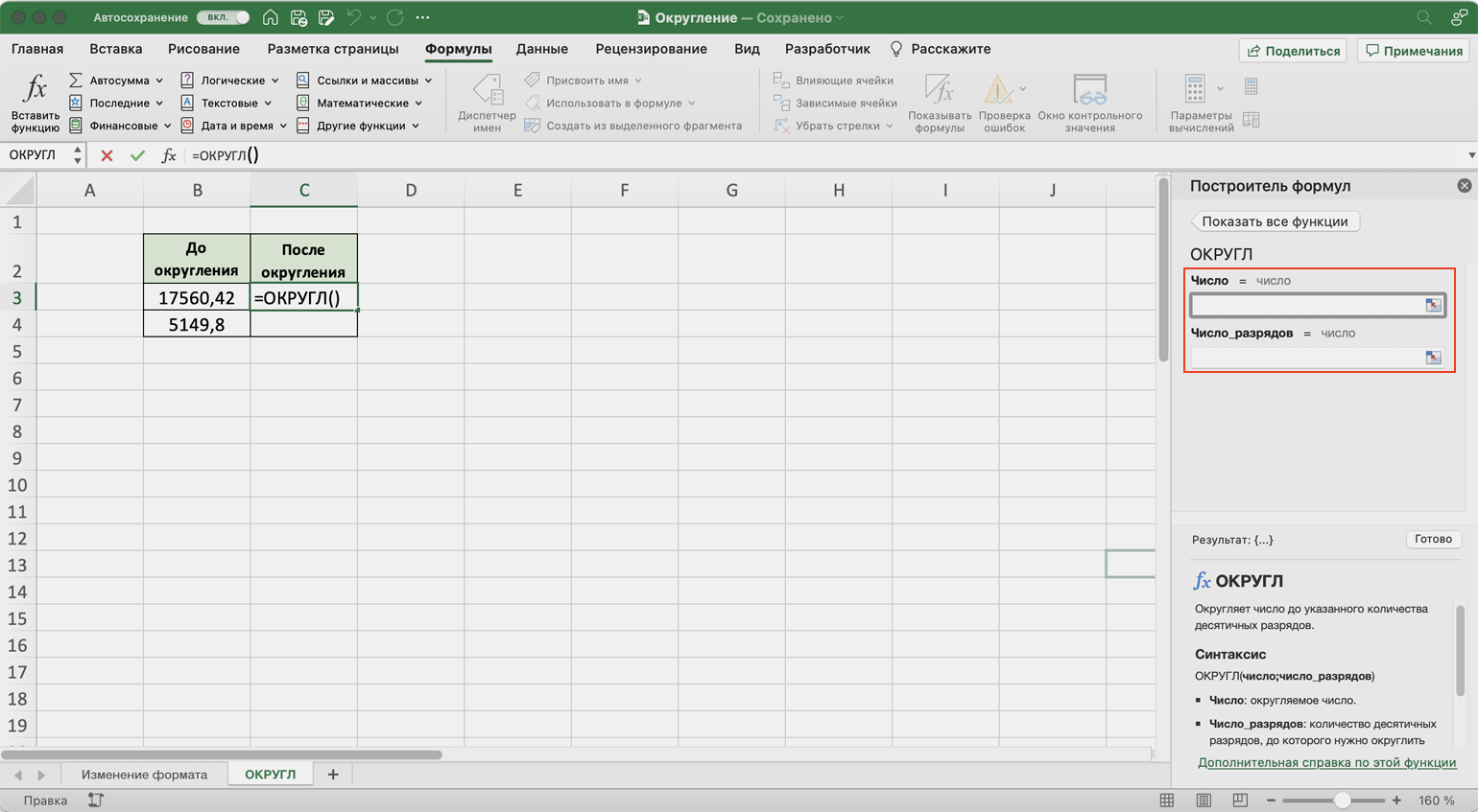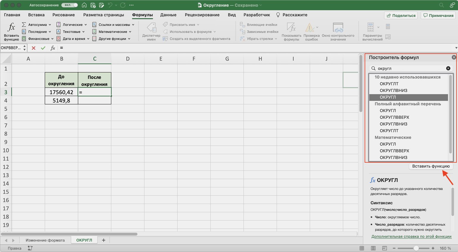 Справа появляется окно «Построитель формул». В нём через поисковик находим функцию ОКРУГЛ и нажимаем «Вставить функцию».