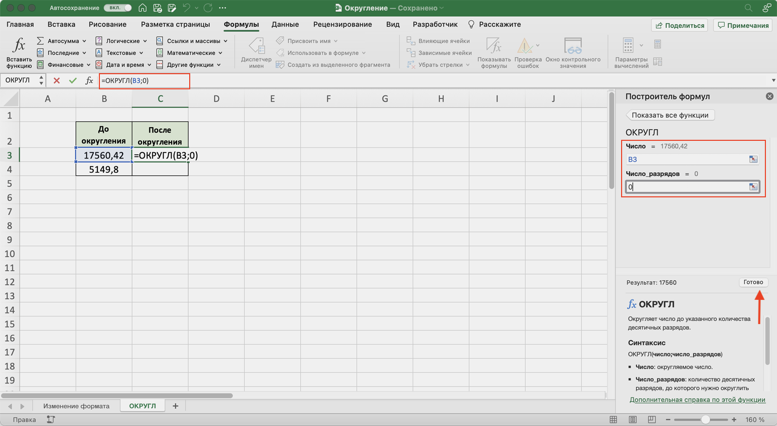 В итоговом виде функция получается такой: fx=ОКРУГЛ(B3;0). Нажимаем кнопку «Готово».