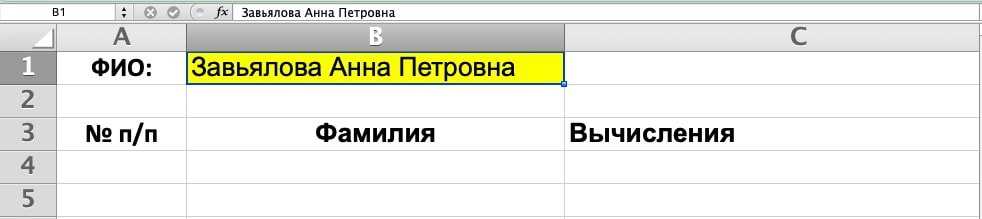 На новом чистом листе табличного редактора Excel в ячейку B2 вводим ФИО (Завьялова Анна Петровна) и выделяем ее желтым цветом для наглядности. Также размечаем таблицу наших последующих действий (рис. 1).