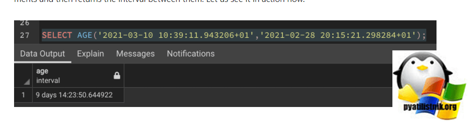 В первом сценарии мы хотели бы рассчитать время в днях, прошедшее с момента размещения заказа до его доставки. Это можно сделать в PostgreSQL с помощью функции AGE(). Эта функция принимает в качестве аргументов две метки времени и затем возвращает интервал между ними. Давайте теперь посмотрим, как это работает.