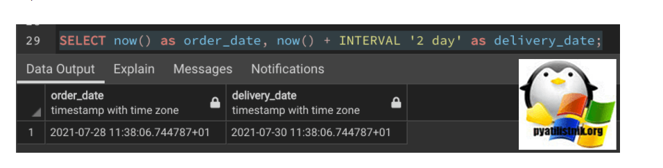 Видно, что разница между метками времени составляет около 9,5 дней. Точно так же мы можем использовать функцию INTERVAL, чтобы добавить время к существующей метке времени и вернуть новую метку времени. Это полезно, если мы хотим установить дату через фиксированный период времени. Например, при размещении заказа нам может потребоваться рассчитать дату доставки на основе интервала времени доставки. Это можно сделать следующим образом.