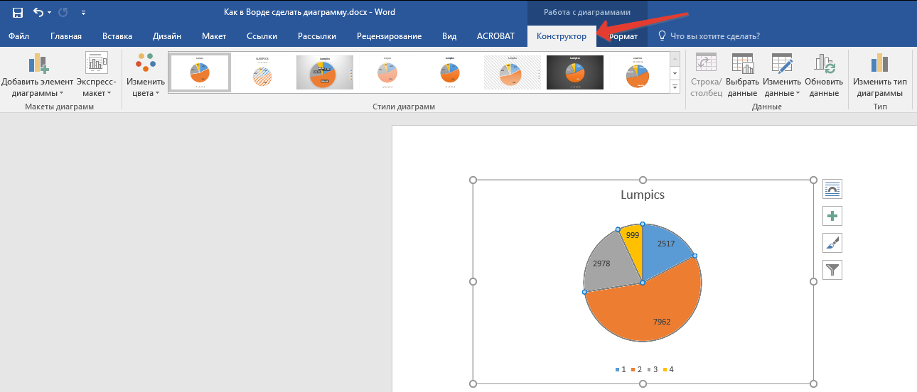1. Кликните по диаграмме, которую вы хотите изменить, и перейдите во вкладку «Конструктор»