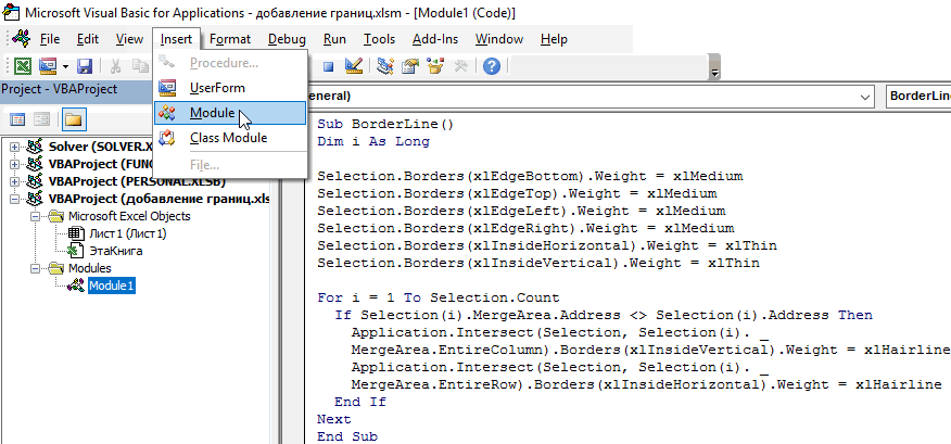 Стили границ по краям и внутри ячеек и диапазонов описывают константы из коллекции XlLineStyle.
