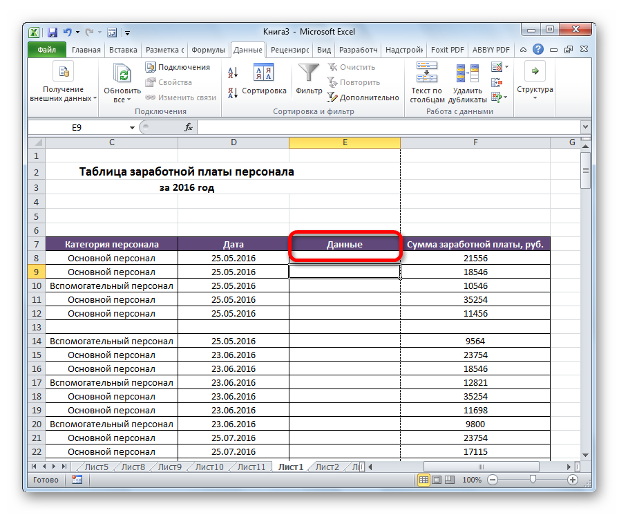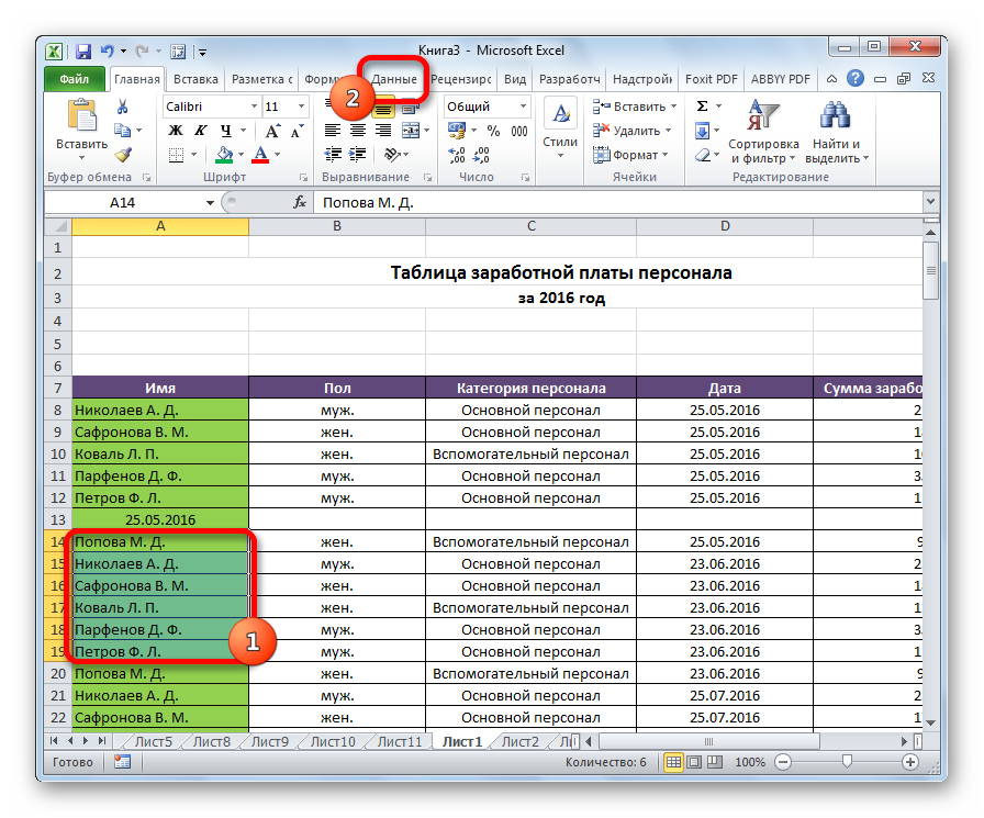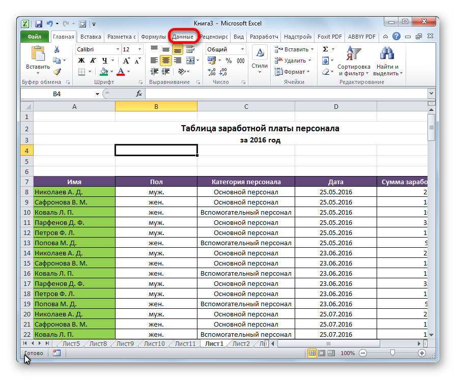 Выделяем строчки, которые необходимо сгруппировать, не считая итоговой строчки. Перебегаем во вкладку «Данные».