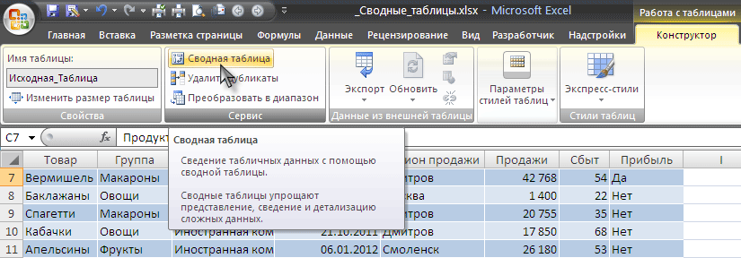 Имея исходную таблицу в формате EXCEL 2007 , для создания Сводной таблицы достаточно выделить любую ячейку исходной таблицы и в меню Работа с таблицами/ Конструктор/ Сервис выбрать пункт Сводная таблица .