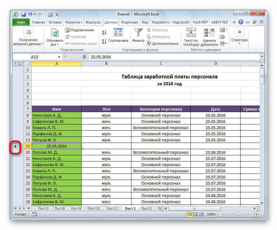 Группа готова. Аналогично, как и при группировании столбцов, её можно сворачивать и разворачивать, нажимая на знаки «минус» и «плюс» соответственно.