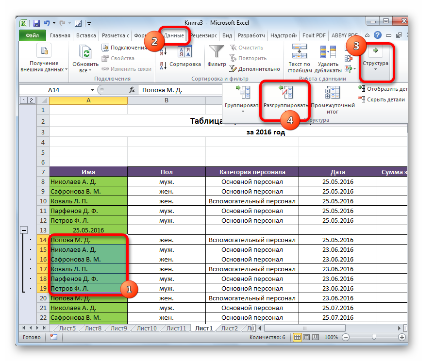 Теперь выделенные группы будут расформированы, а структура листа примет свой первоначальный вид.