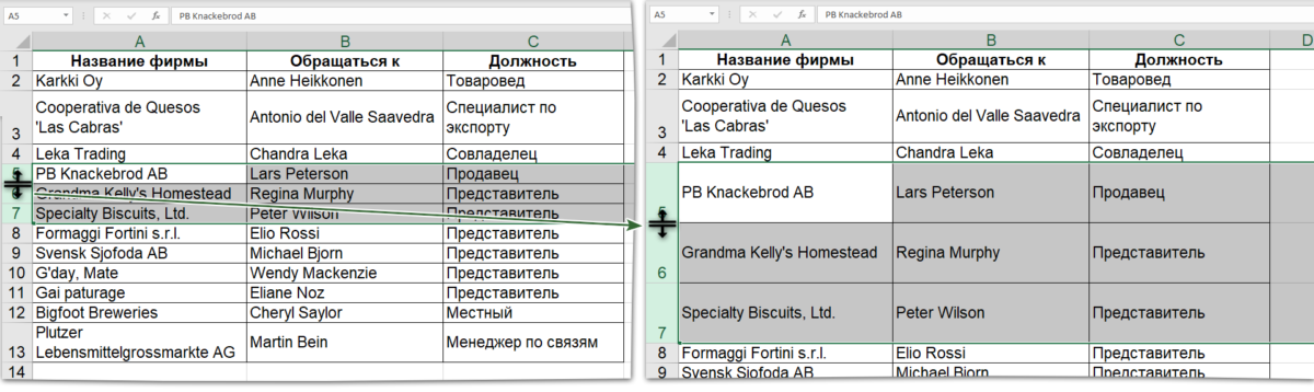 Как видите, не стоит перетаскивать то, что не изменяет размеры ячеек — границы между ячейками предназначены вовсе не для этого! Кроме того, такое ошибочное перетаскивание приводит к операции “Вырезать & Вставить” для захваченных ячеек. Если такое получилось случайно, то просто воспользуйтесь отменой действия, а не возвращайте всё вручную.