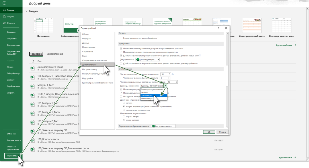 Шаг 6. Команда Файлы → Параметры → закладка Дополнительно → раздел Отображение → Единицы на линейке → выбор нужной единицы измерения: