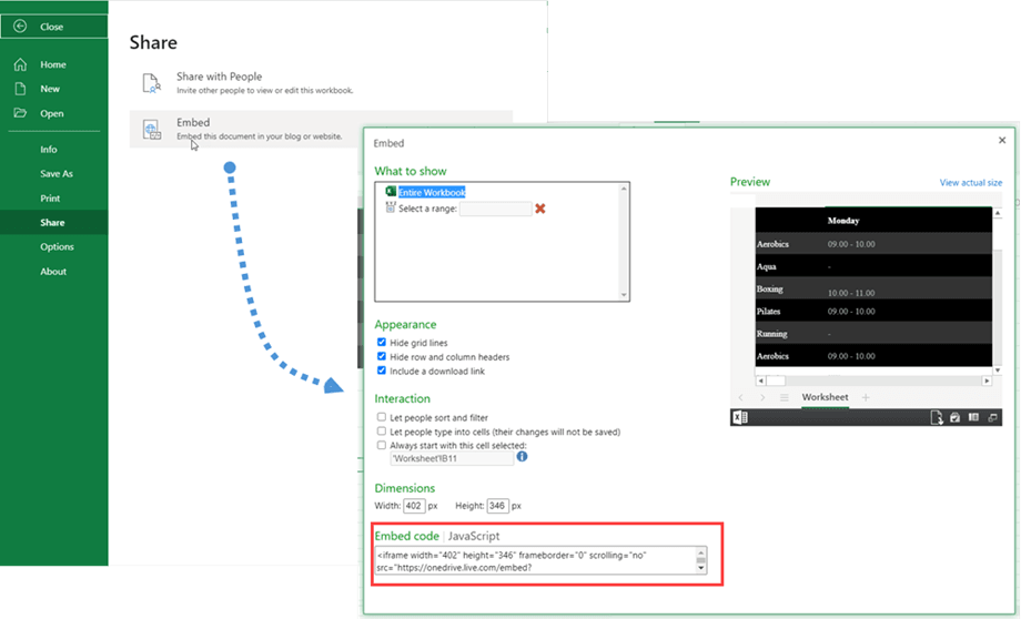 Итак, сначала откройте файл Excel в OneDrive и перейдите в меню «Файл»> «Поделиться»> «Вставить» .