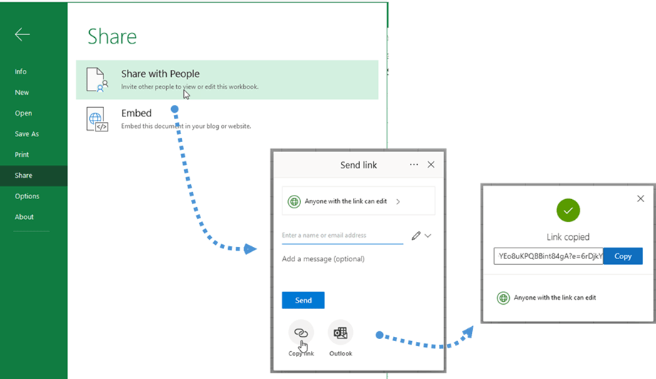 Во всплывающем окне « Отправить ссылку» нажмите кнопку « Копировать ссылку» . Затем ссылка копируется, например: https://joomunited-my.sharepoint.com/:x:/g/personal/joomunited_com/ETcoorIno75ElJJaVVs5g1UB8Yq9DYEo8uKPQBint84gA?e=riQdcz