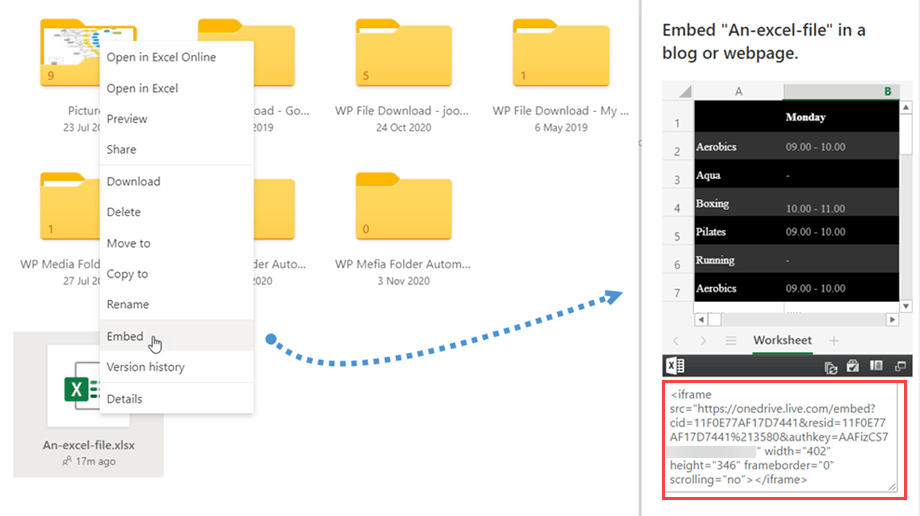 С другой стороны, на панели управления OneDrive щелкните правой кнопкой мыши файл Excel и выберите « Вставить» . Вы также можете получить код для встраивания.