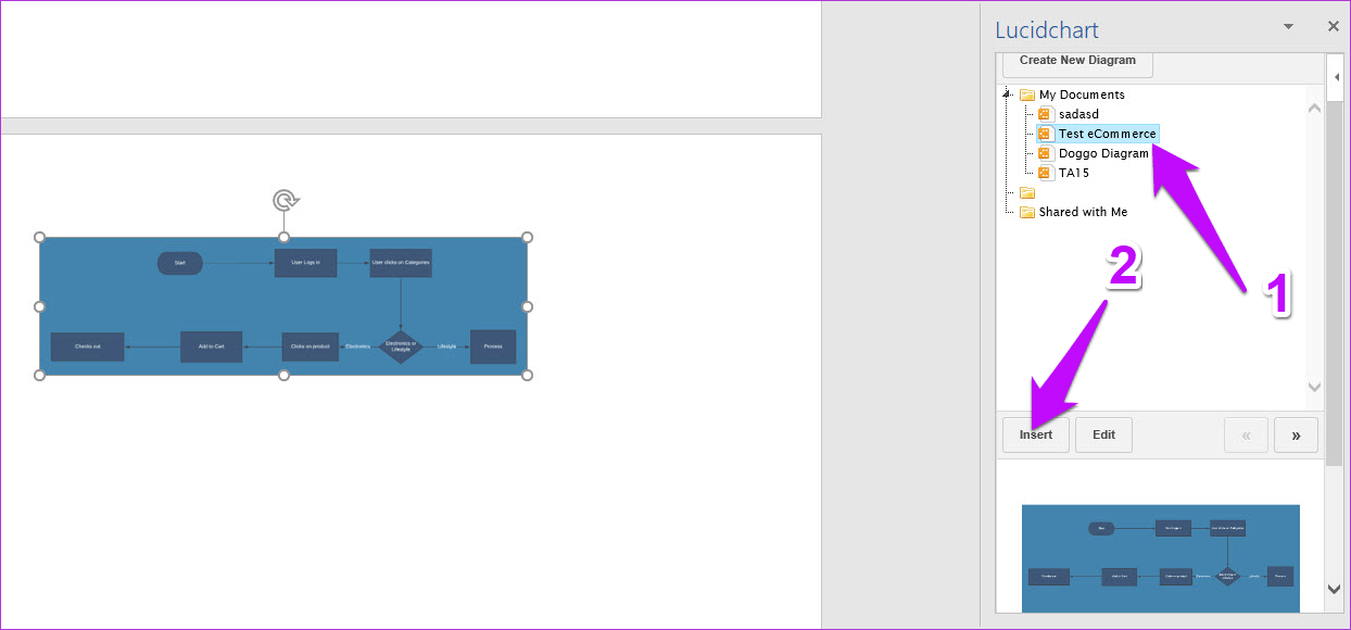 После проверки имени пользователя и пароля Lucidchart загрузит все ваши диаграммы в правой панели.