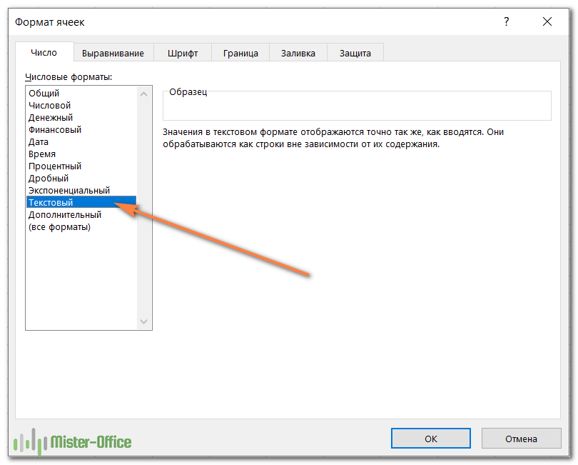 - Выберите текст из списка категорий на вкладке «Число».