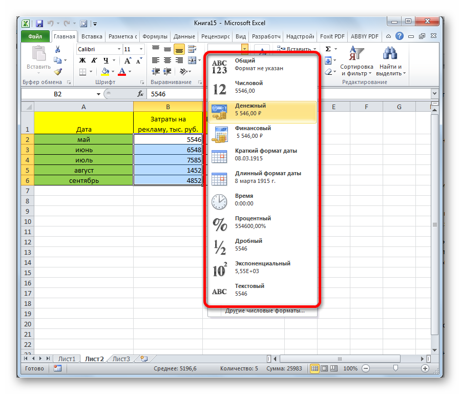 - Раскрылись основные варианты формата. Выбираем тот, который нужен в выделенной области. Форматирование изменилось.