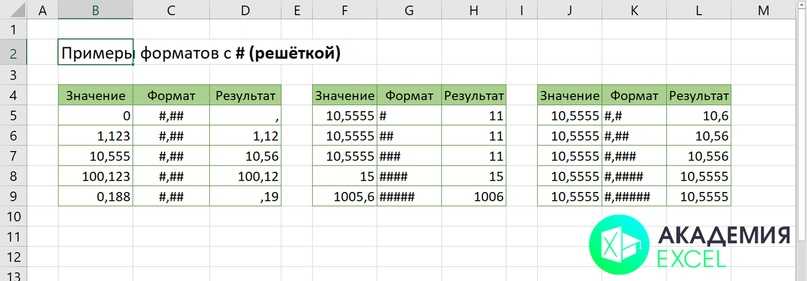 Знак решетка (#) является заполнителем для необязательных цифр. Когда число имеет меньше цифр, чем # символов в формате, ничего не будет отображаться. Например, пользовательский формат #, ## будет отображать 1,15 как 1,15 и 1,1 как 1,1.
