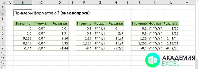 Вопросительный знак (?) Аналогичен нулю, но отображает пробелы для незначащих нулей по обе стороны от разделителя. Используется для выравнивания цифр. Когда знак вопроса занимает место, которое не требуется в количестве, будет добавлено пространство для поддержания визуального выравнивания. Используется также в дробях с переменным количеством знаков.